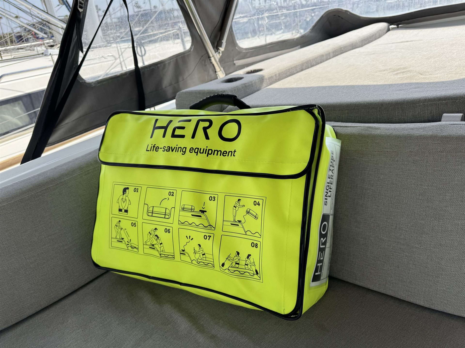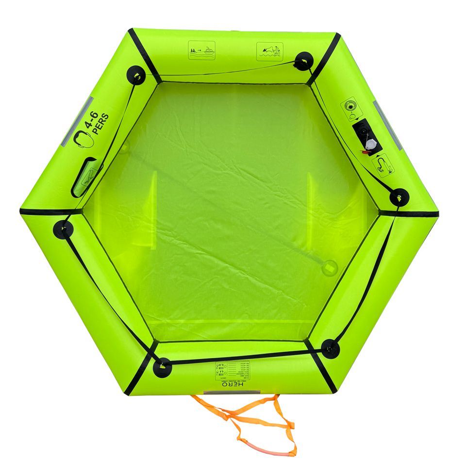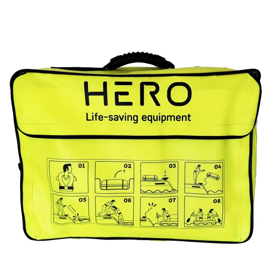 Die HERO SINGLE TUBE Rettungsplattform bietet die Möglichkeit, über Bord gefallene Personen aus dem Wasser und danach wieder auf das Schiff zu bekommen. Die kompakten Abmessungen der Tasche erlauben eine Lagerung auch auf kleinen Schiffen. Die Plattform bläst sich nach Aktivierung innerhalb weniger Sekunden auf und liegt durch ihre hexagonale Form mit verstärkten Ecken stabil auf dem Wasser. Sie bietet Platz für 4-6 Personen.