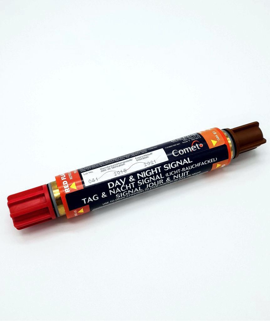 Kompaktes Handsignal, kombiniert auf der einen Seite eine rote Handfackel und auf der anderen Seite eine orange Rauchfackel.